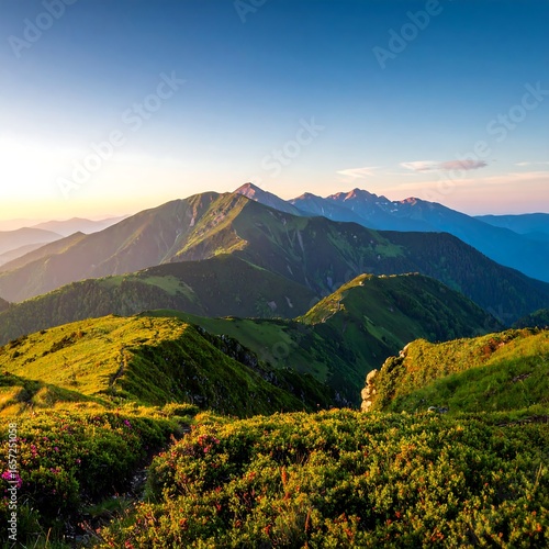 Mountainous landscape, vibrant greens and sunrise