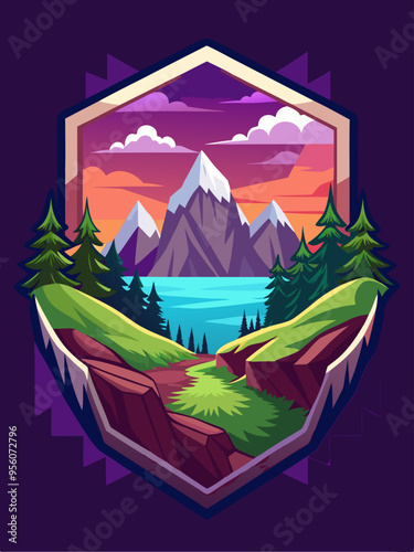 Mountainous Landscape with a Lake and Pine Trees at Sunset