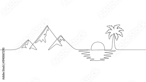 Mountains and palm tree on island with sunset over water, continuous one line drawing. featuring ocean, sea, landscape with nature and travel
