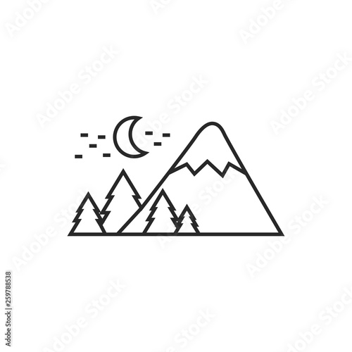 Mountains covered with snow at night illustration. Traveling vector outline icon.