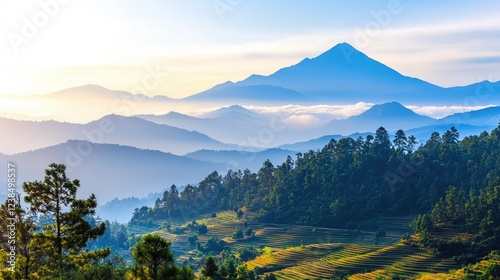 Mountains landscape nature idea. Breathtaking mountain view with lush forests and rolling hills under a clear blue sky.
