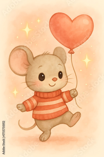 Mouse happily walking with a heart balloon on a bright cheerful day