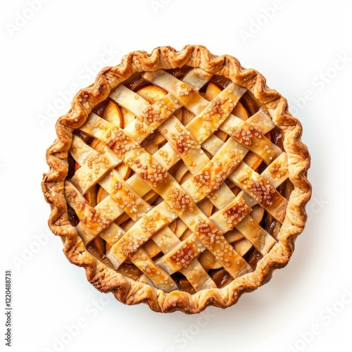 Mouthwatering apple pie features a lattice crust and sits on a white background, tempting viewers with its sweet aroma and inviting texture