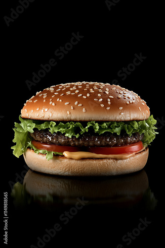 Mouthwatering cheeseburger with melted cheddar, fresh lettuce, tomato slice, and sesame seed bun, perfect for fast food branding, restaurant menus, food advertisements, and culinary photography