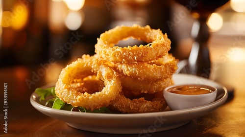 Mouthwatering Crispy Golden Onion Rings Stacked High on a Plate with Dipping Sauce