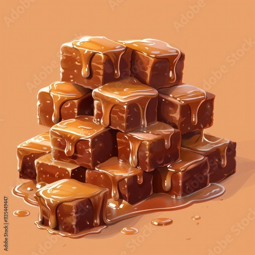 Mouthwatering pile of glistening golden caramel coated candies stacked and drizzled with additional caramel set against a warm toned orange and brown backdrop