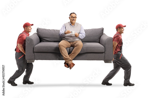 Movers carrying a couch with a mature man sitting and drinking coffee