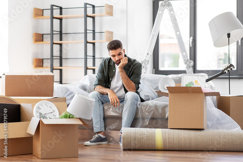 moving, eviction and real estate concept - sad man with boxes at new home
