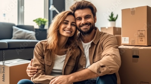 Moving house, Happy couple having break during moving to new house, Real estate concept.
