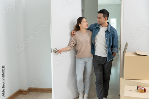 Moving house, relocation. Happy couple show new condominium or house, inside the room was a cardboard box containing personal belongings and furniture. move in the apartment.