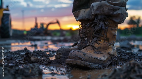 Muddied labor boots at dusk on the construction site