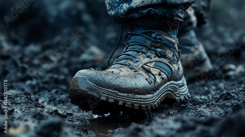 Muddy boots on a rugged terrain. Close-up of military-style hiking boots stepping through a muddy puddle