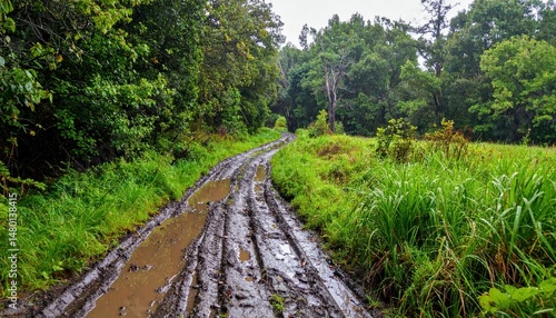 Muddy Trail Surrounded by Lush Greenery in a Natural Landscape