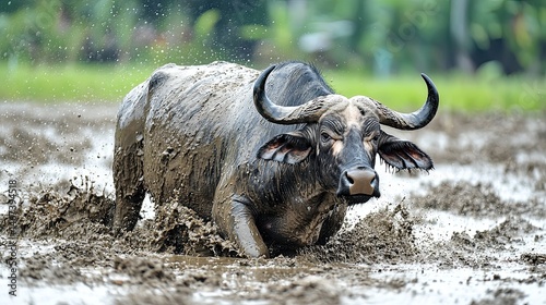 Muddy water buffalo wallowing in a paddy field