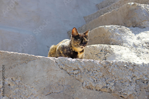Müde, alte und heimatlose Katze vor einer Steintreppe
