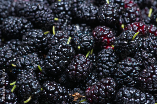 Mulberry background. Fresh Mulberrys top view. Black Berries wide Backdrop