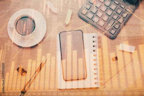 Multi exposure of forex graph hologram over desktop with phone. Top view. Mobile trade platform concept.