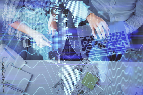 Multi exposure of man and woman working together and forex graph hologram drawing. Financial analysis concept. Computer background. Top View.