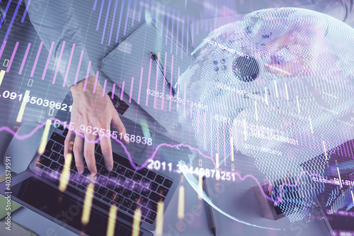 Multi exposure of man's hands typing over computer keyboard and forex graph hologram drawing. Top view. Financial markets concept.