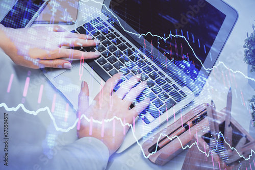 Multi exposure of woman hands typing on computer and forex chart hologram drawing. Stock market analysis concept.