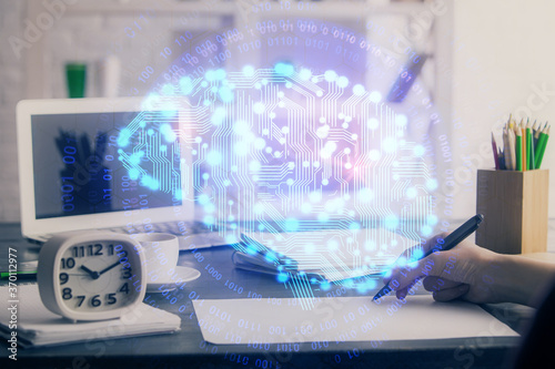 Multi exposure of writing hand on background with brain hologram. Concept of learning.