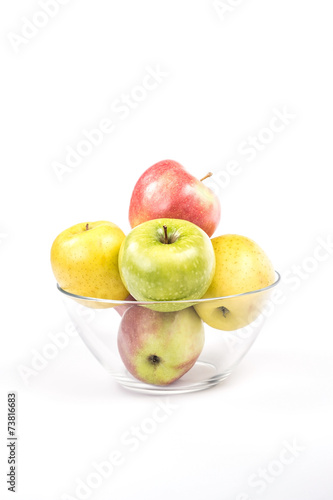 multicolored apples in a transparent bowl