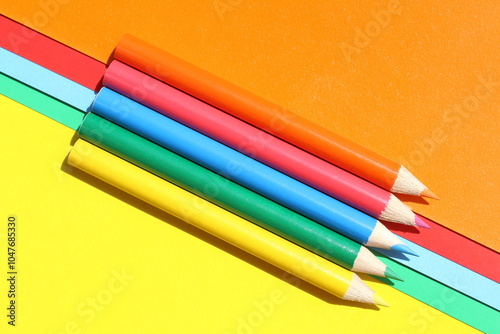 Multi-colored bright pencils lie on multi-colored paper.