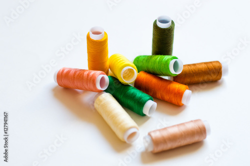 multicolored spools of thread on white background