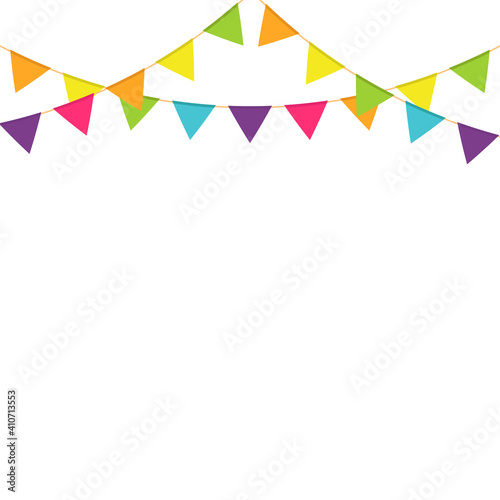 Multicolored triangular flags on ropes on a white background. Decoration from triangular flags.