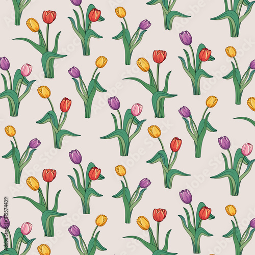Multi-colored tulips in a pattern.Vector seamless pattern with bouquets of multi-colored tulips.
