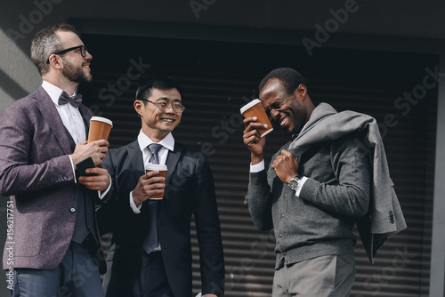 multicultural businessmen holding paper coffee cups and standing outdoors, business people team concept