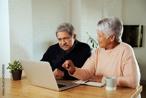 Multi-cultural elderly couple sitting at modern kitchen counter with laptop. Wife explaining to husband.