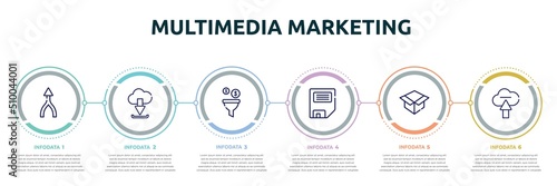 multimedia marketing concept infographic design template. included merging, download from cloud, conversion, disquette, unboxing, upload to cloud icons and 6 option or steps.