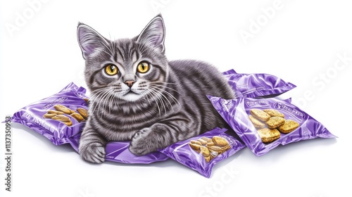 Multiple cat food packets in violet shades, gray tabby cat illustrations with golden eyes, professional product arrangement, white background, studio lighting