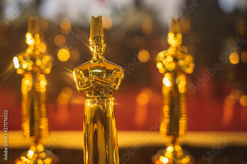 Multiple Golden chef trophy use in cooking competition close up.