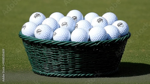 Multiple golf balls neatly organized in a driving range basket, ready for a practice session