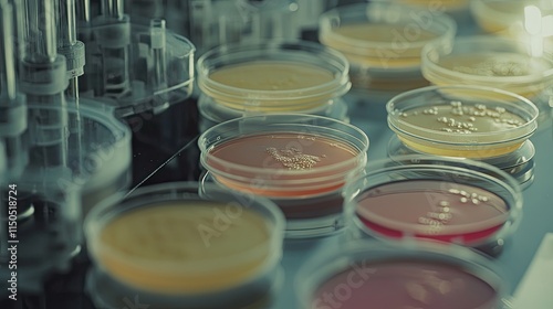 Multiple petri dishes containing diverse microbial colonies in a sterile lab environment for microbiological analysis.