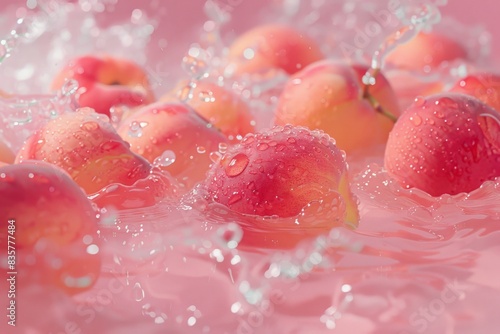 Multiple ripe peaches with water droplets are splashing in pink water, creating a vibrant and dynamic scene that highlights their freshness and juicy texture.