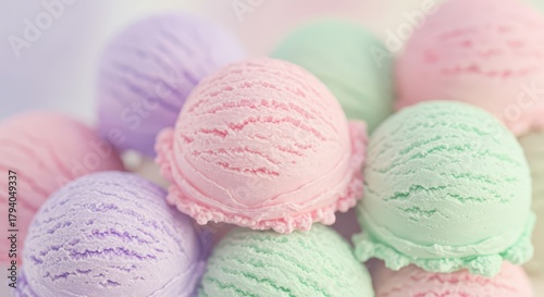 Multiple scoops of pastel colored frozen dessert piled together in a close up view