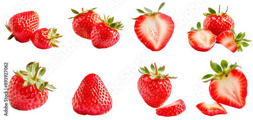 Multiple Strawberries in Various Cuts and Angles on Transparent Background