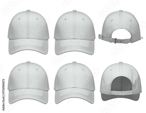 Multiple views of plain white baseball caps, front, back and side angles