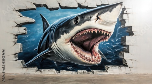 Mur avec graffiti représentant un grand requin blanc coloré, illusion d'optique, street art.