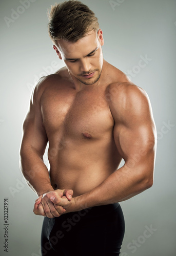 Muscle, flexing and body of man for fitness, health and exercise for training goal on white studio background. Strong, sports and bodybuilder model with sexy, young and healthy abs from sports