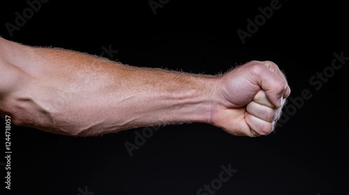 Muscular arm clenched fist, dark background, strength concept, fitness poster