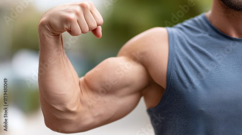 Muscular arm flexing with visible veins and defined biceps, showing strength and fitness in sleeveless shirt during workout or training session outdoors