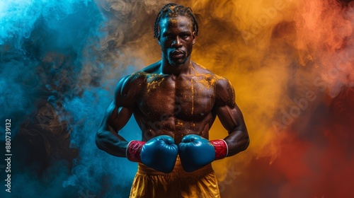 Muscular Black Boxer Posing With Gloves On, Surrounded By Blue And Orange Smoke. Sports And Fitness