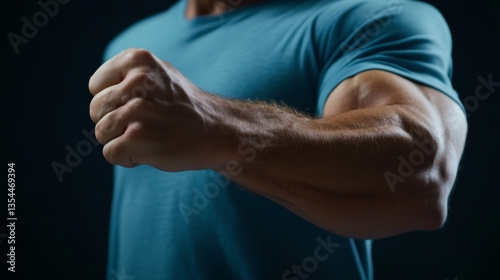 Muscular male fist flexing against dark background showcasing strength and determination