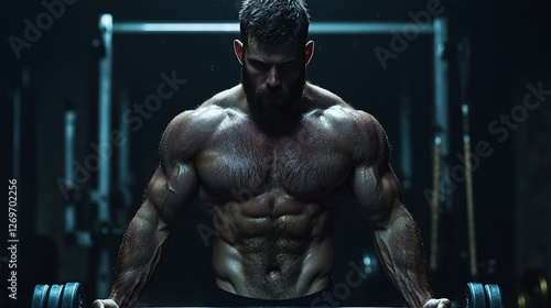 Muscular man lifting weights in a gym.