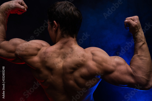Muscular man showing muscles isolated on the black background with colored smoke. Concept of healthy lifestyle