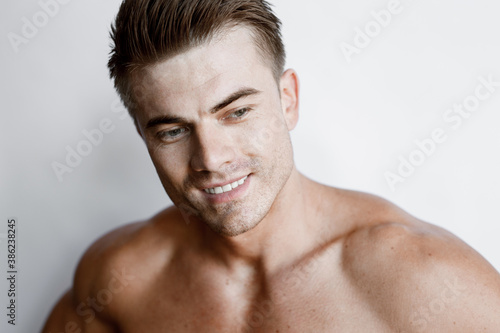 Muscular sexy model sports young man on white background. Portrait of beautiful smiling healthy guy.